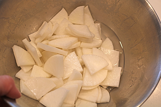 1.将白萝卜切成约 5~8mm 厚的半月片。加入盐拌匀后静置,待其出水。