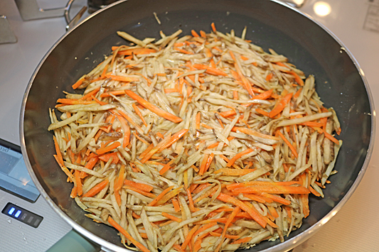 1.用刷子或刀背去除牛蒡表皮,切成细丝后泡水,再用厨房纸吸干水分。胡萝卜切丝。