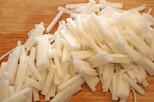 1.将萝卜切成4厘米长、约5毫米粗的细条。切厚一些更有嚼劲。