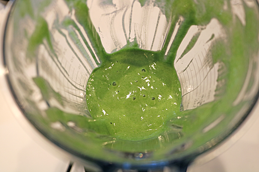 5.放凉后加入菠菜和50ml牛奶,用搅拌机搅拌成顺滑状。