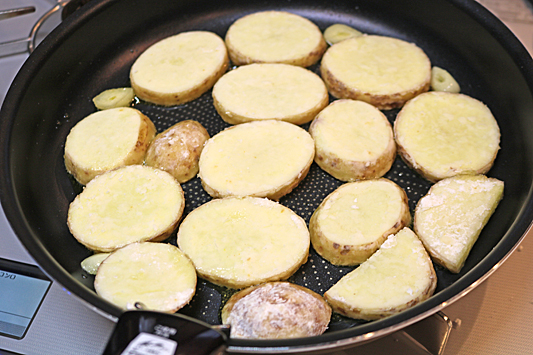 当蒜香散发出来后,将土豆片单层排入锅中,用小火至中小火煎制。