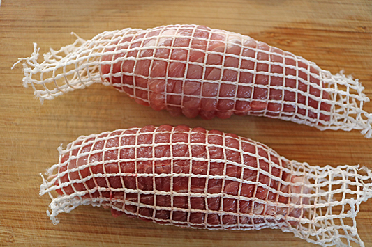 1.用棉绳将猪肉块捆扎好,或放入网袋中以固定形状。