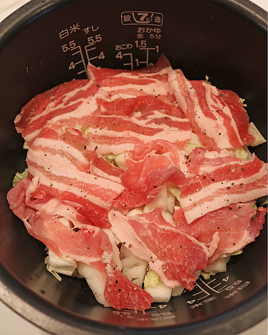 2.五花肉切成約5公分長,鋪上1/3肉片。重複白菜→肉→白菜→肉,最上層放白菜葉。