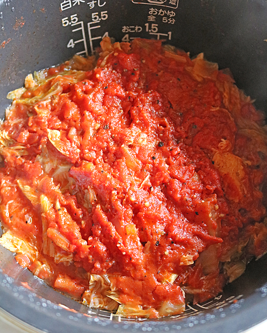 3.將番茄罐頭壓碎,與清酒、大蒜、高湯粉、糖混合,倒入電鍋內。