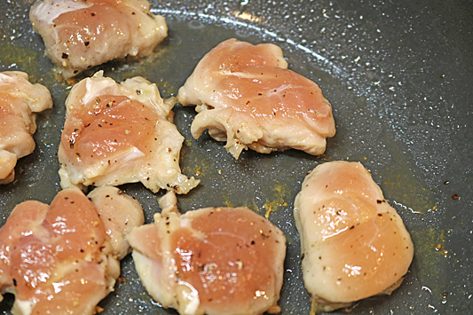 2.將雞腿肉切成一口大小,用鹽和胡椒調味。