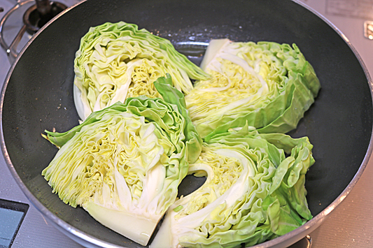 4.用廚房紙巾擦拭鍋中殘渣,再加熱剩下的橄欖油,將高麗菜排入鍋中,加蓋用中火煎煮。
