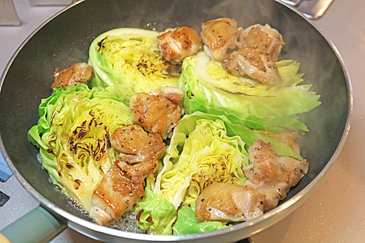 5.底部煎至上色後翻面,將雞肉放入高麗菜縫隙中,加入料理酒與高湯粉,加蓋蒸煮1~2分鐘。