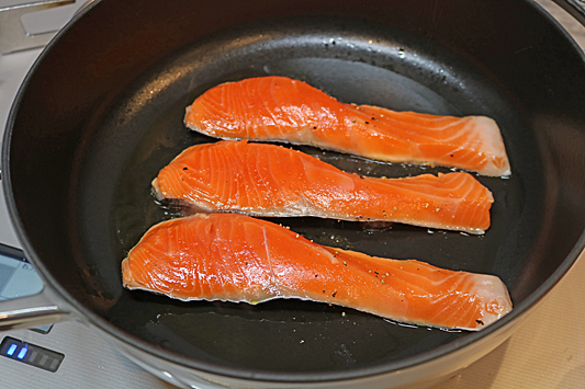 3.平底鍋中加1大匙橄欖油,中火將鮭魚帶皮面朝下放入,煎至金黃。翻面快速煎後取出備用。