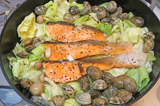 5.放回鮭魚,將蛤蜊擺周圍,倒入白葡萄酒和水,加蓋小火蒸煮約6分鐘。