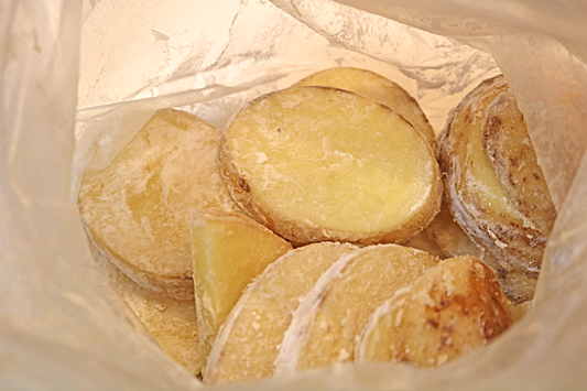 注入一些空氣後封口,搖晃袋子讓每片馬鈴薯均勻裹粉。