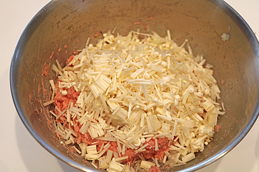 3.Add the enoki mushrooms and chopped onion to the pork mixture. Mix until evenly combined.