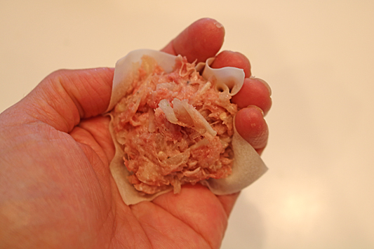 4.Place a shumai wrapper in your hand, spoon the filling onto the center, and gently shape into a round dumpling.