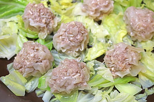 5.Line a frying pan with the chopped cabbage and place the shumai on top.