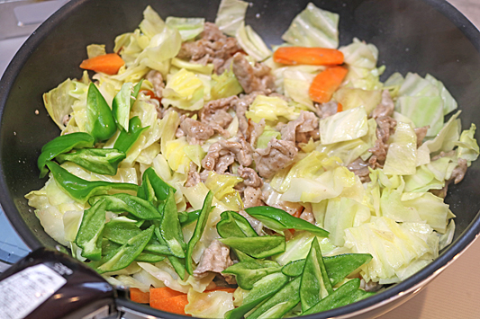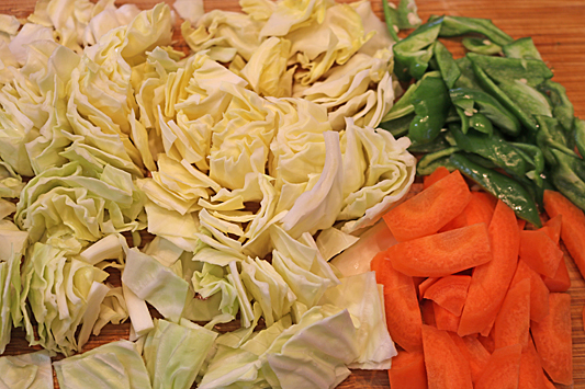 4.When the pork is mostly cooked, add the carrots and cabbage.