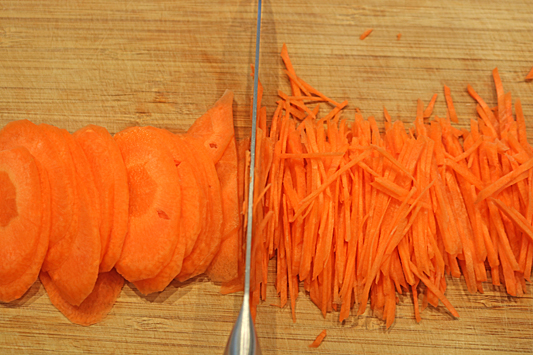 1.Slice the carrot diagonally into thin pieces, then cut into matchsticks.